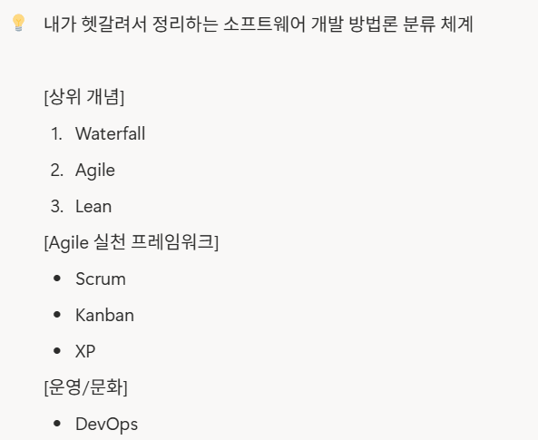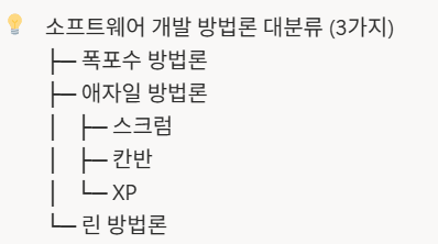 예 ) 칸반(Kanban) / 스크럼(Scrum) / 익스트림 프로그래밍 (Extreme Programming, XP)
