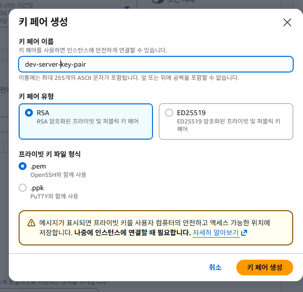 => 키 페어 생성 이후 생성되는 키는 유출 시 다른 사람이 접근 가능하기 때문에 잘 보관하면 된다.