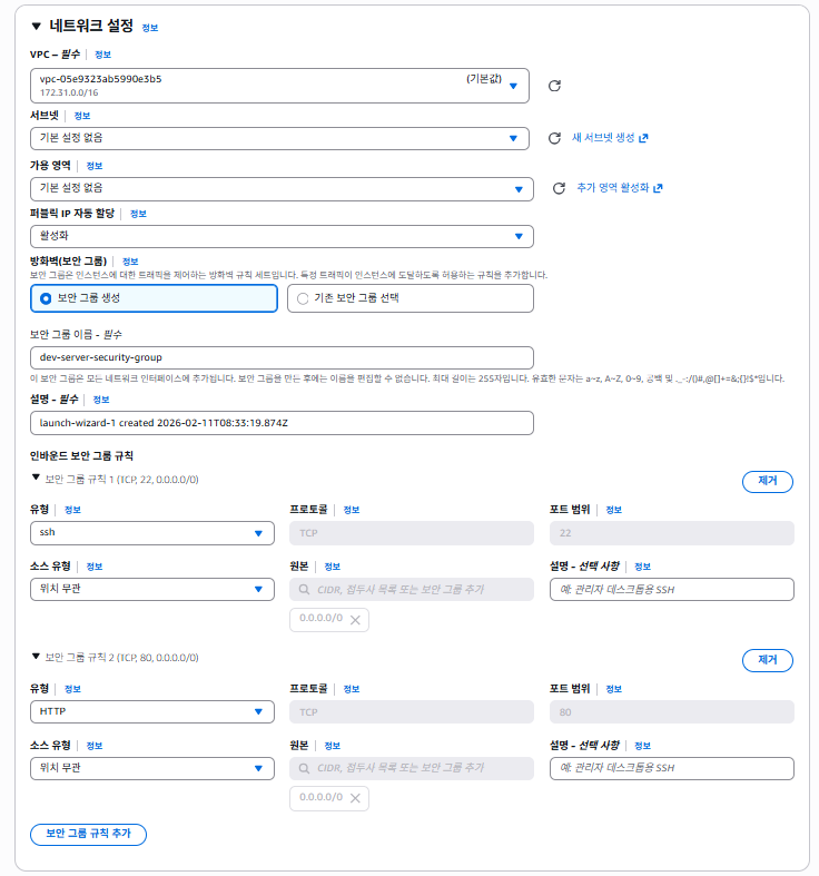 보안 그룹 이름 (필수 입력 : dev-server- security-group)