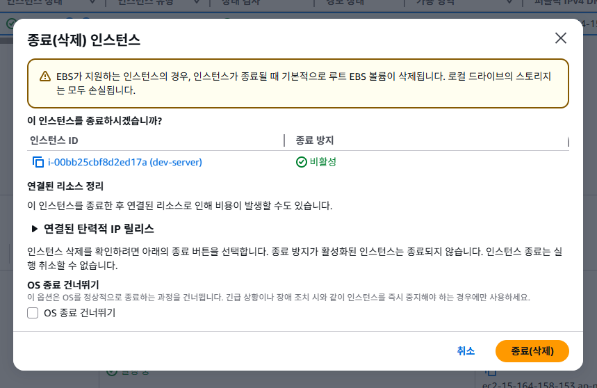 사용했던 EC2 인스턴스 종료를 선택하면,,, 연결된 리소스 정리 부분에서 이 인스턴스를 종료한 후 연결된 리소스로 인해서 비용이 발생 할 수 있다고 나오는데 이말은 탄력적 IP 연결도 종료해야한다는 말이다.