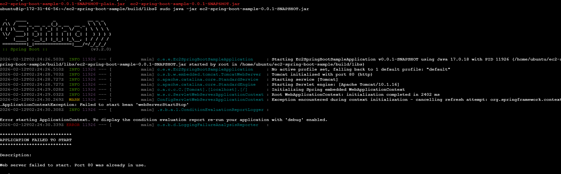 이때, ubuntu@ip-172-31-46-56:~/ec2-spring-boot-sample/build/libs$ 해당 위치에서 .jar 파일 진행하기