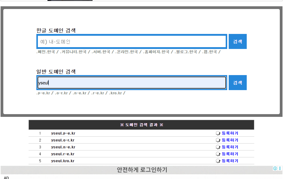 일반 도메인 검색 부분에 내가 사용하고 싶은 도메인을 검색해보면 등록 가능한 도메인 목록을 볼 수 있다.