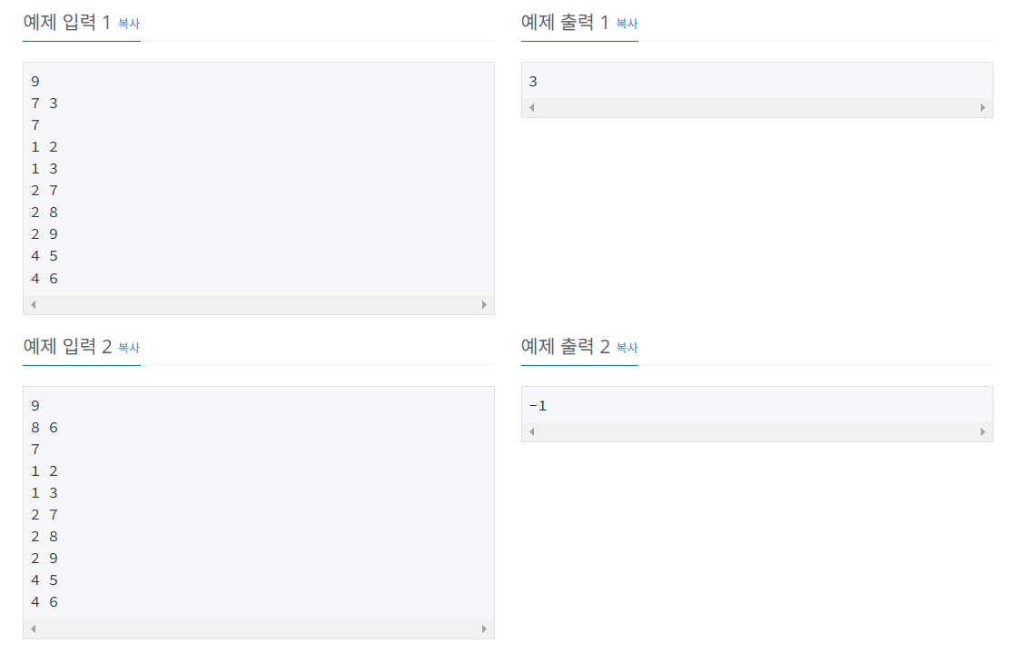 두 노드 간 최단 경로를 참색하여 촌수를 계산하는 문제이다. 만약에 노드가 연결되어 있지 않은 경우 -1을 출력한다.