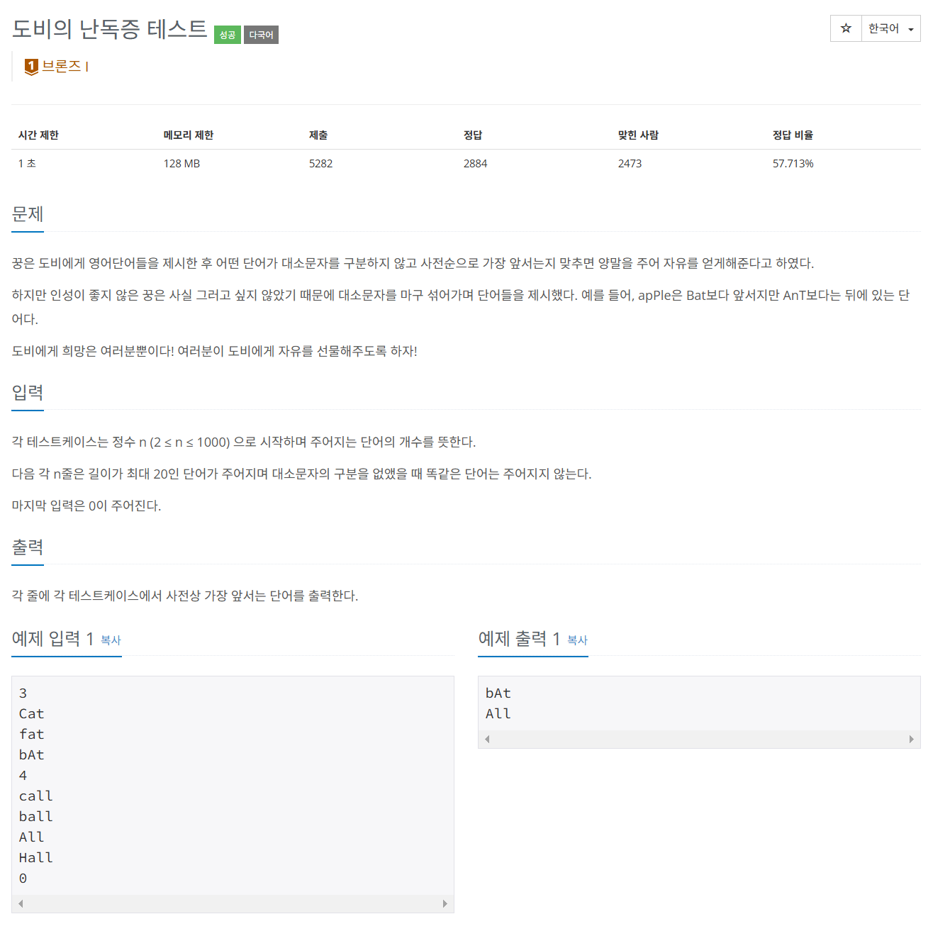 글자의 대소문자를 구분하지 않고 사전순으로 정렬해서 해당 정렬이 사전순으로 가장 앞에 있는 단어를 출력하는 문제이다.... 즉, 2개의 포인트 ( 대소문자 구분 X , 사전순 가장 앞 순서 출력 ) 를 만족하면 된다.