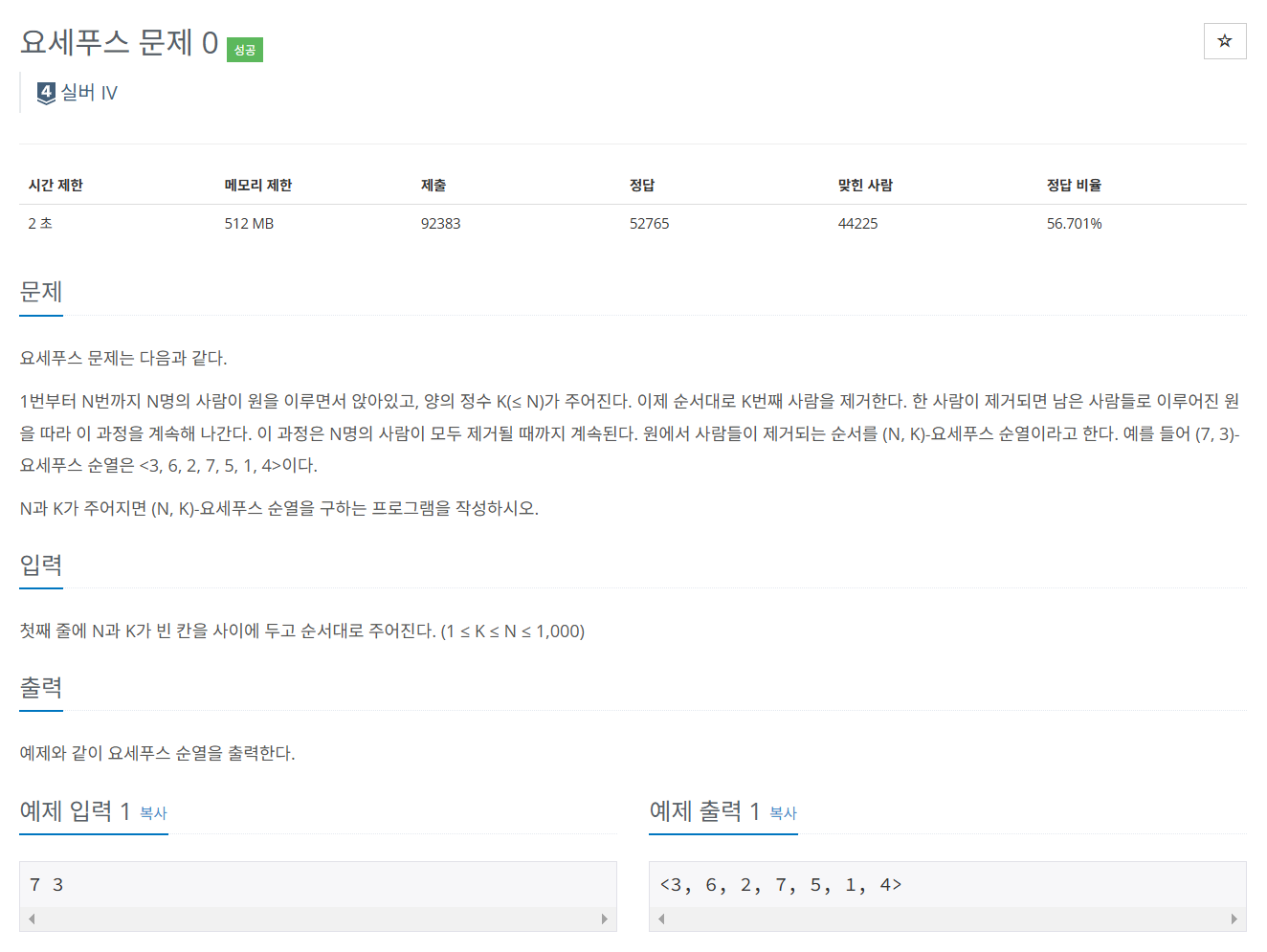 원형으로 앉아있는 형태에서 특정 순서의 사람을 제거하는 과정을 진행해야하니까... 큐 사용해서 순열처리하는게 깔끔할거같음.
