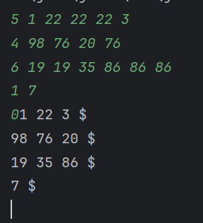 2. 출력시, 각 라인에서 첫번째 열에 위치한 N의값 제외 + 연속된 중복 제외 추측한 숫자들 나열 + 마지막에 $ 기호로 마무리한다.