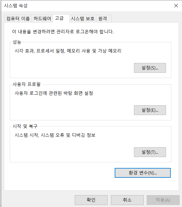 환경 변수 설정 (window 10)