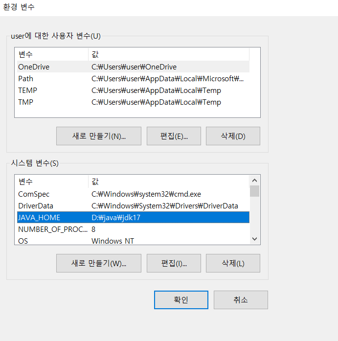본인은 D:\java\jdk17 경로로 변경해서 설치하였기 때문에 변경된 값으로 변수 값에 입력한다.