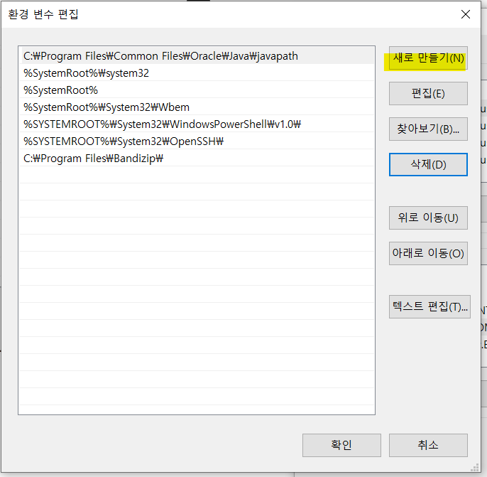👨🏫 %JAVA_HOME%\bin 새로 만들기 선택해서 추가한 다음 제일 위로 이동