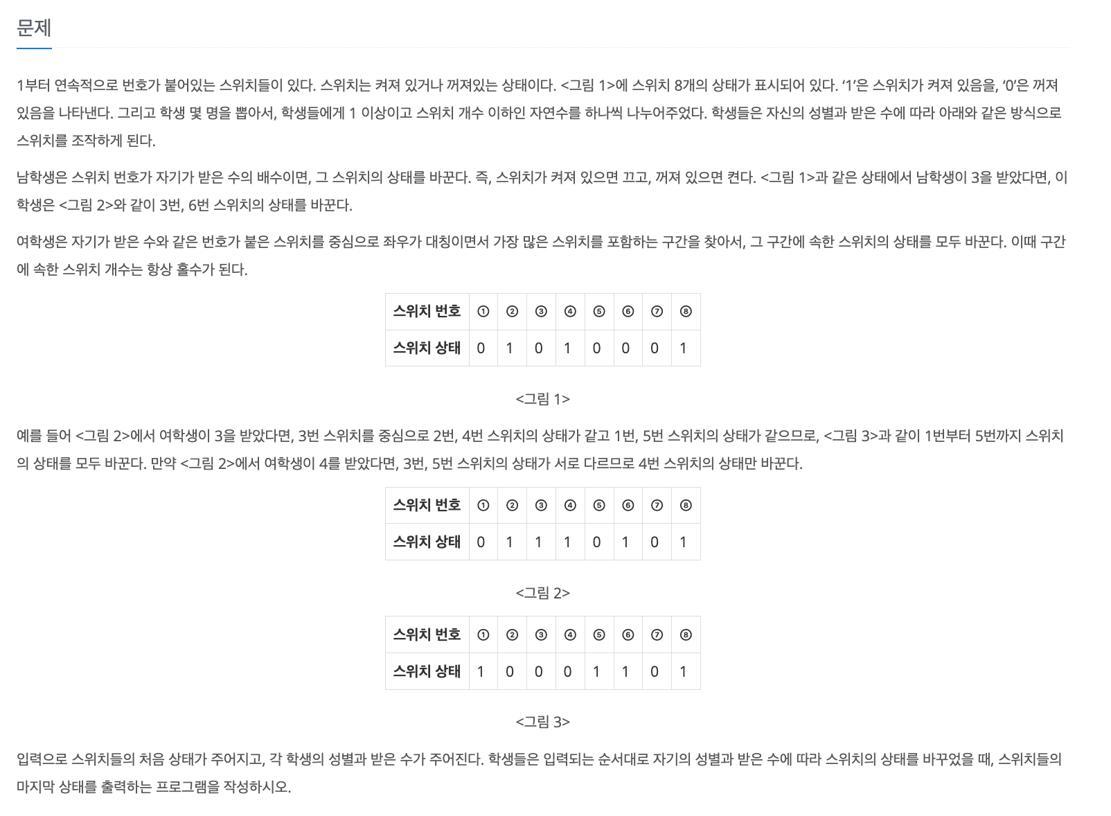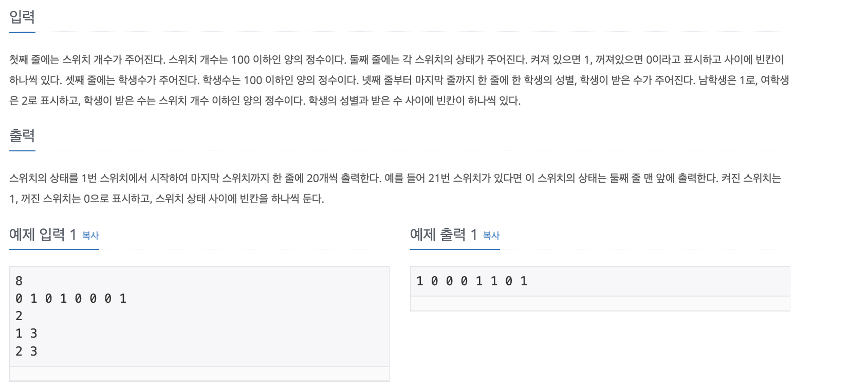최종적으로 학생들이 상태 변경 끝낸 뒤 스위치들의 상태를 출력하는 문제이다.
