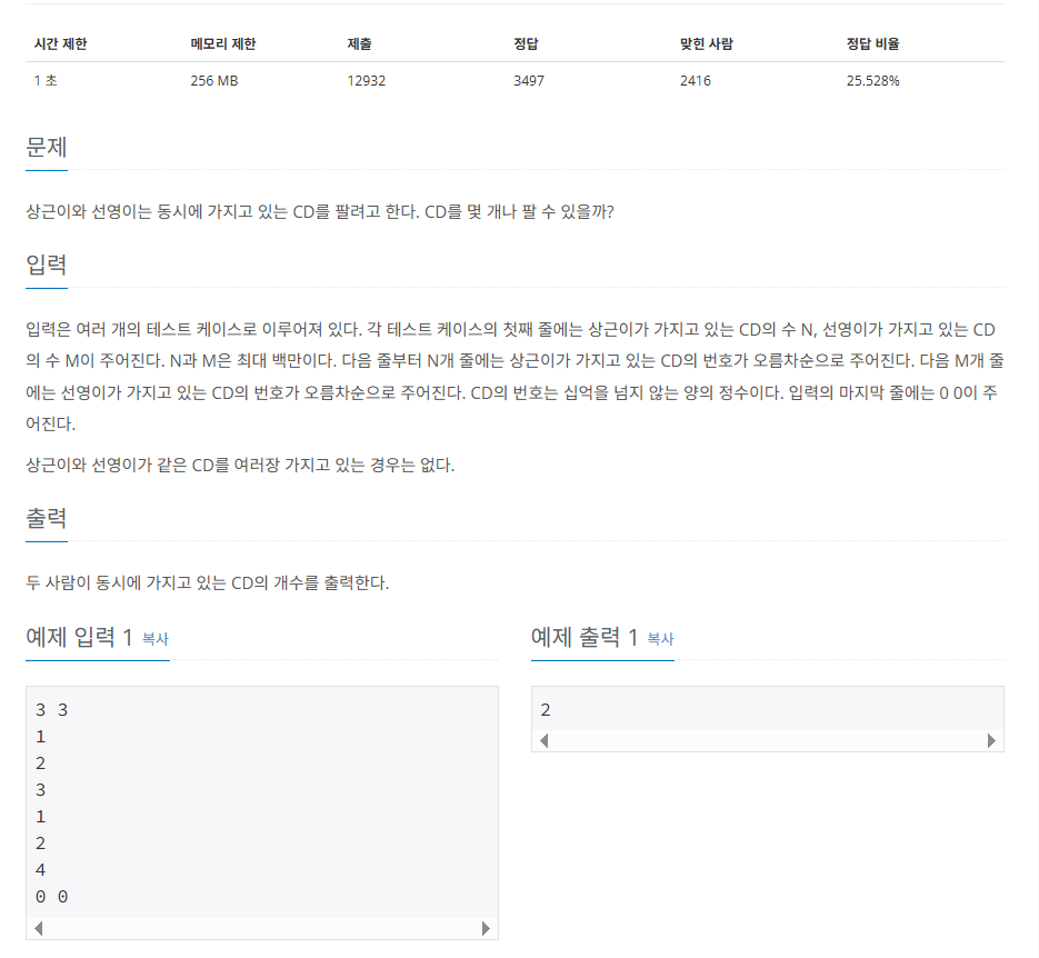 두 배열에서 공통된 원소의 개수를 출력하는 문제이다. CD 번호들이 정렬된 상태로 들어오기때문에 이분탐색을 이용하면 효율적으로 풀 수 있다.