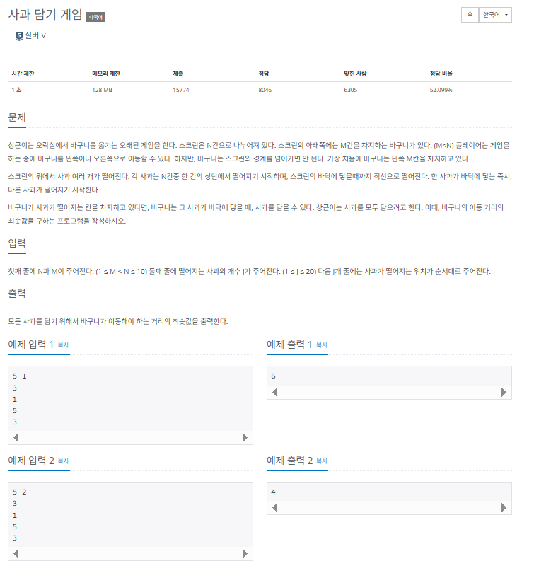 N칸으로 구성된 스크린이 있고 바구니는 M칸을 차지하고 처음에는 스크린의 가장 왼쪽에 위치한다. 사과가 한번에 하나씩 J번 떨어진다면 모든 사과를 바구니에 담기위한 바구니를 움직인 거리의 최솟값을 구하는 문제이다.