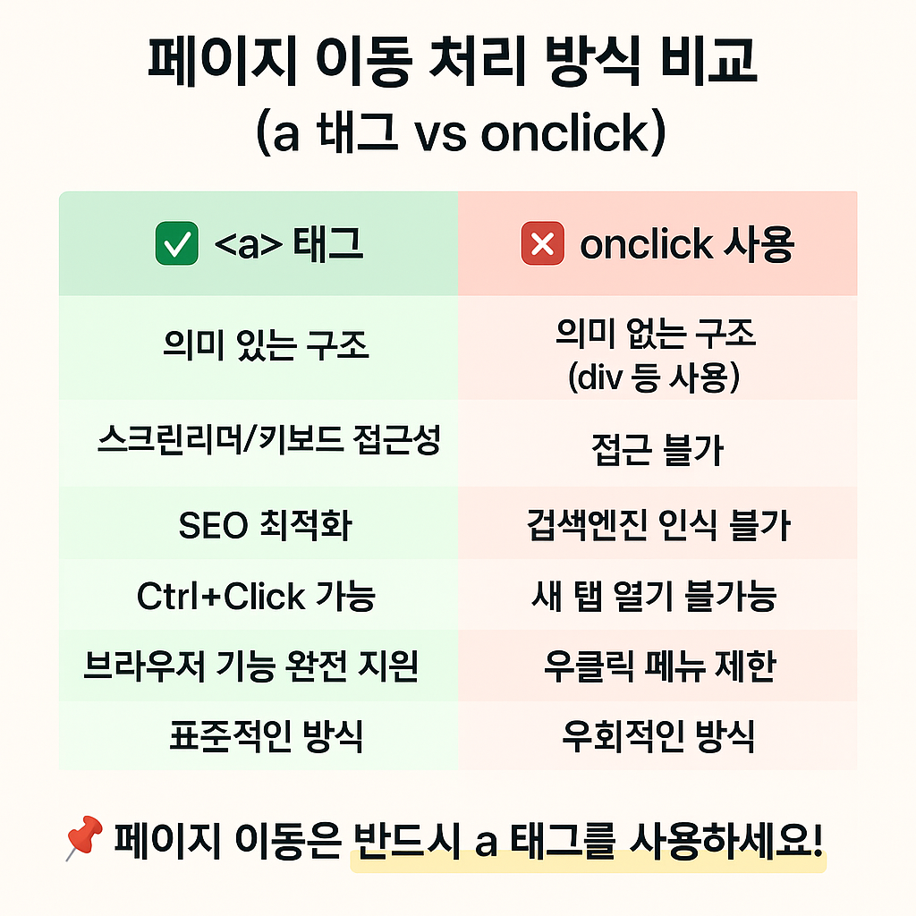 두 방식은 UI 상에서는 비슷하게 동작할 수 있지만 a 태그는 단순히 작동만 하는 것이 아니라 웹의 의미론적 구조, 접근성, SEO, 브라우저 기본 기능 등 다양한 요소에서 정석적인 방식인 반면, onclick은 페이지 이동이 아니라 모달 열기, 메뉴 토글, 상태 변경 같은 UI 상호작용 처리에 더 적합한 방식입니다.즉, 목적에 따라 사용해야하는 두가지 방식입니다.